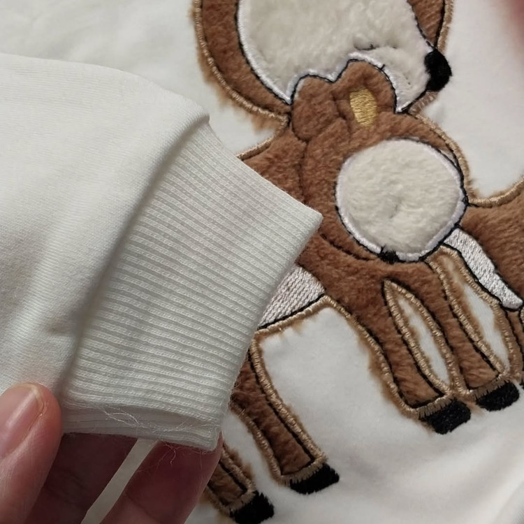 سر آستین ، پایین لباس و قسمت مچ پا کشبافت بکار رفته. بخش عروسکیشم پشمالوعه.