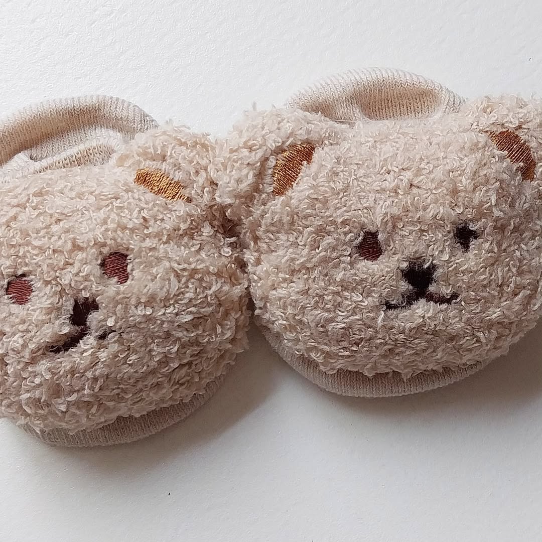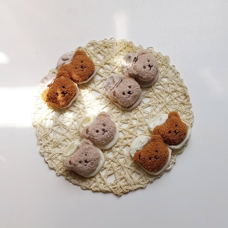 اسلاید پنجم تدی پشمالو کرم رنگه روی جوراب خاکی رنگ. سایزبندی نوزدای تا دو/سه سال دارن.