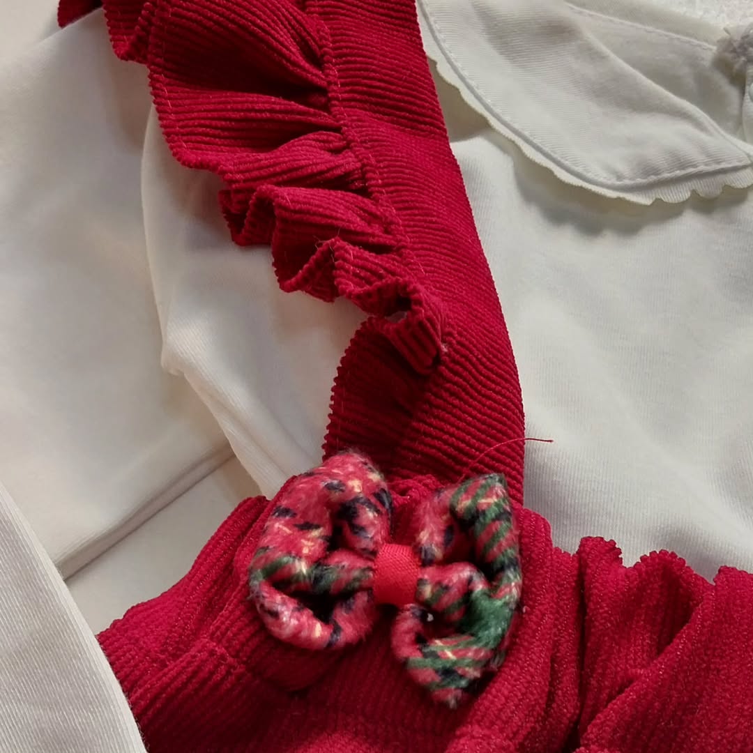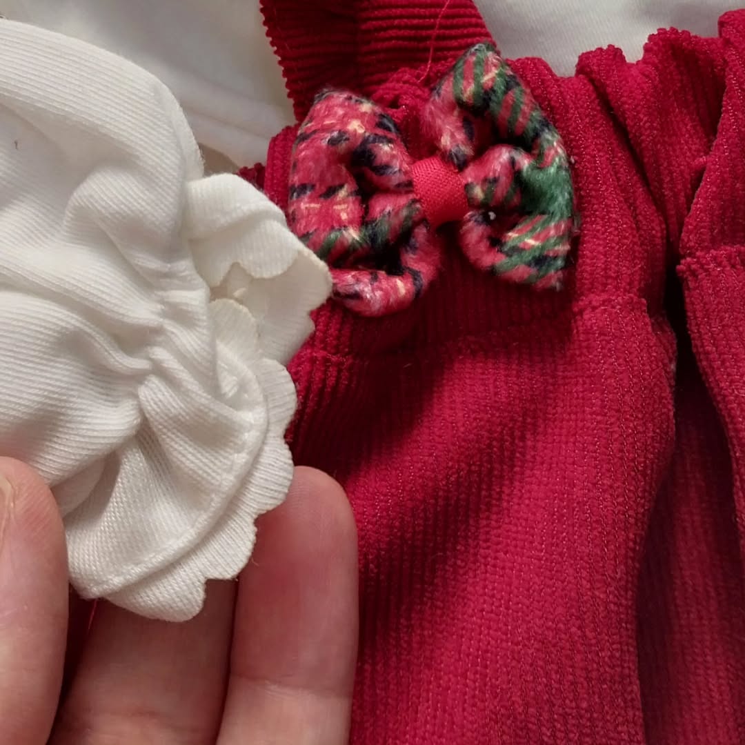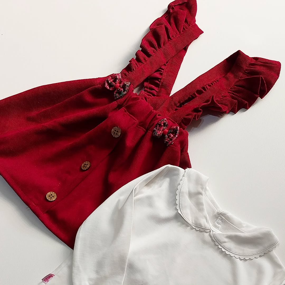 ست دو تیکه دخترونه این ست دلبر شامل بلوز یقه ب نخ پنبه و سارافون آستین چیندار، از جنس مخمل کبریتیه. میدونی خوبیه این ست چیه؟ اینه که میتونی هر کدوم رو جدا استفاده کنی. خودت ورق بزن جزئیات قشنگشو ببین. قسمت پشت گردن بلوز، دکمه داره که موقع تعویض لباس کوچولوتون اذیت نمیشه. قسمت کمر سارافون هم کش کار شده و تا چند ماه میتونین تن دختر قشنگتون کنین.
