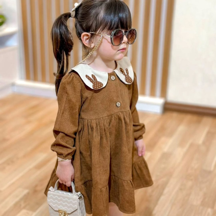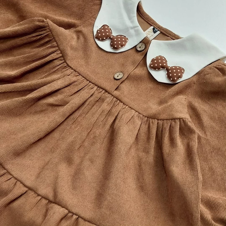 جلوی سارافون دوتا دکمه چوبی داره که راحت تن میشه. کیفیتش خیلییییی عالیه. روی یقهش پیکسل پاپیون خوشگل داره که خیلی کیوتش کرده. مچ استینشم کش کار شده. حتما ورق بزن ببین ، جزء به جزئشو عکس گرفتم.