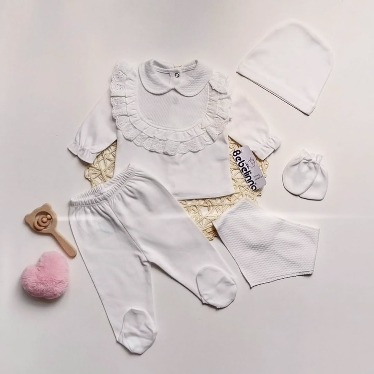 این ست پنجتیکه ترک انقدر ظریف و پرنسسیه که انگار برای لحظههای اول زندگی کوچولوت طراحی شده از اون لباساییه که هم توی عکس روز بیمارستان میدرخشه و هم یادگاریِ قشنگی میشه برای سالها بعد نرم، لطیف، شیک و مناسب پوست حساس نوزاد برند خفن بِبِلینا