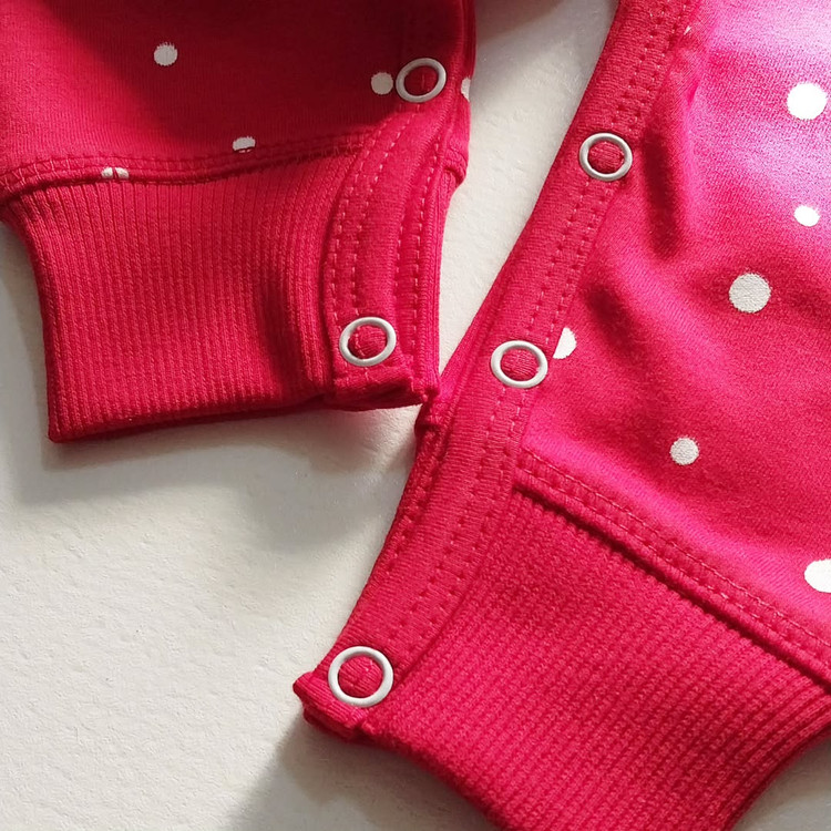 از قسمت جلوی یقه تا مچ پا کامل دکمه کار شده و خیلی راحت میتونین سرهمی رو تن دلبندتون کنین.(فاق هم تماما دکمخوره و تعویض پوشک رو راحت میکنه.)