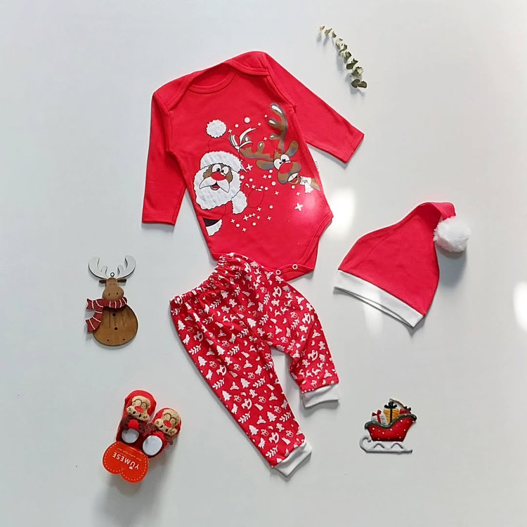 ست سه تیکه شامل کلاه بابانوئل پوم دار، بادی و شلوار کریسمسی ❤️ تقدیم به فرشتههای قشنگ ببر کوچولو 🐯 😘