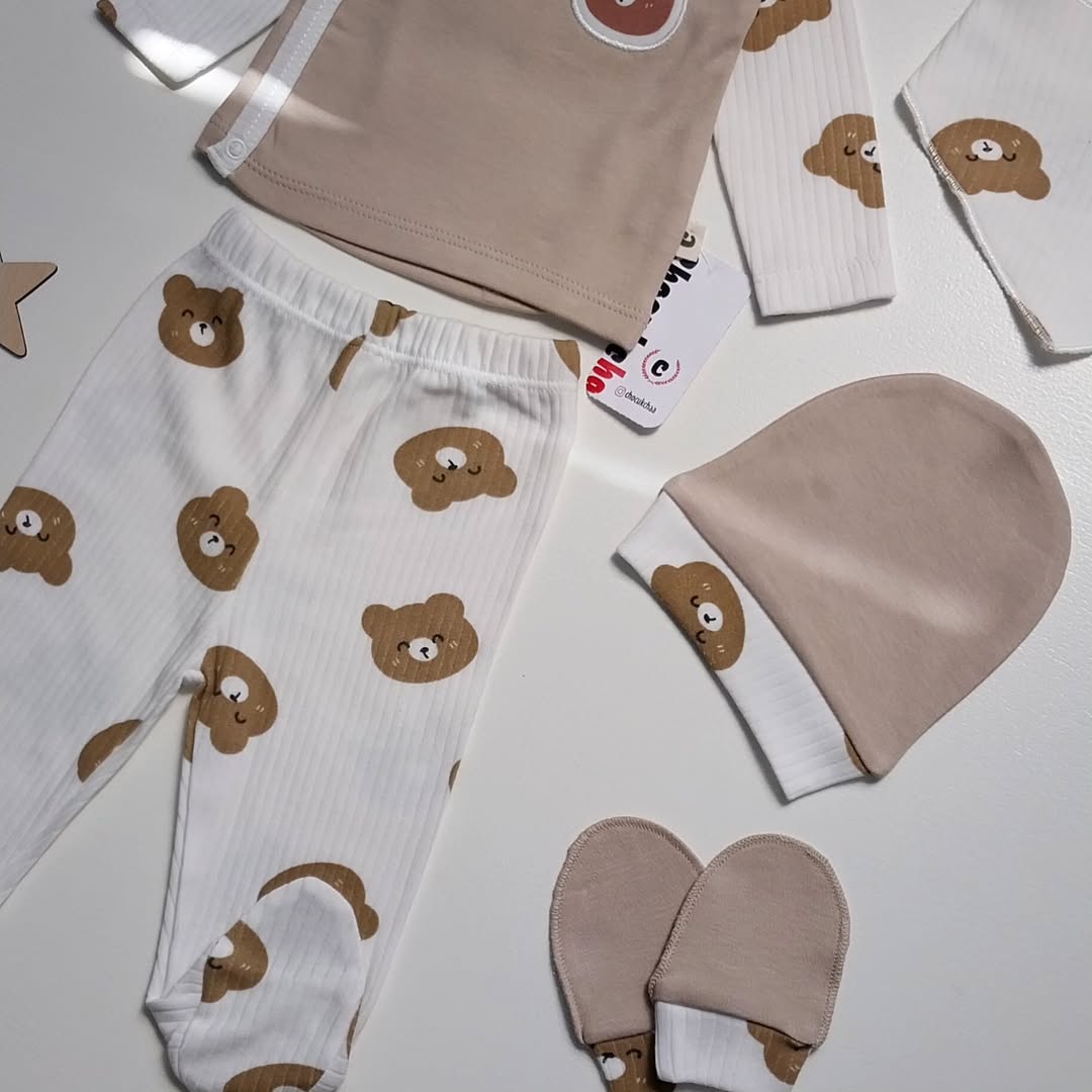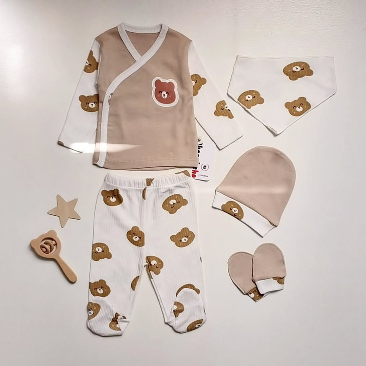ستِ پنج تیکه ترک طرح تدی کیوت @littletiger_kids @littletiger_kids بنظر من طرحش کاملا اسپرته و دختر و پسر نداره ، نظر شما چیه؟ خودت ورق بزن جزئیات قشنگشو ببین. برای عکاسی روز بیمارستان بهترین و شیکترین گزینهس. مناسب ۰هه. شامل کلاه ، دستمال گردن، دستکش ، مانتویی و شلوار جورابداره. نرم و لطیفن و مناسب پوست حساس نوزادن. محصول ترکیهن اندازه هاشو این پایین برات مینویسم چک کن :