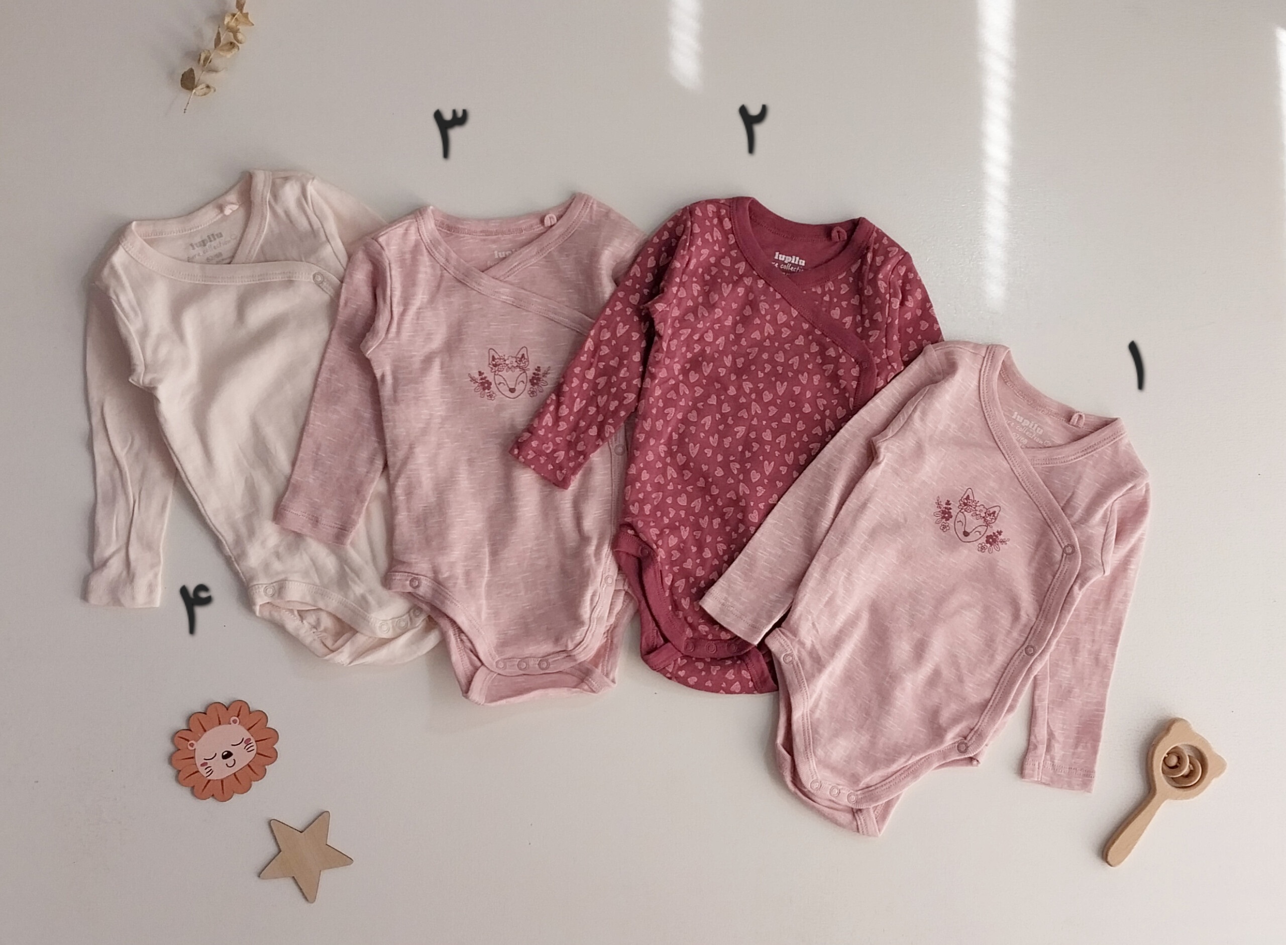 شماره چهار صورتی کم رنگ از برند لوپیلو : سایز ۲ـ۶ ماه پهنا ۲۲ سانت / قد از سرشانه تا فاق ۴۰